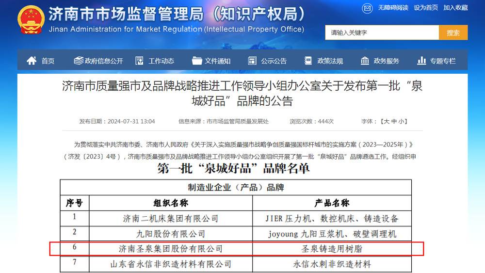 7月31日,济南市政府新闻办举行新闻发布会,介绍济南市第一批“泉城好品”遴选工作情况,并发布第一批“泉城好品”品牌名单。本次获评第一批“泉城好品” 的品牌共计69个,济南圣泉集团股份有限公司凭借铸造用树脂成功入选该名单。