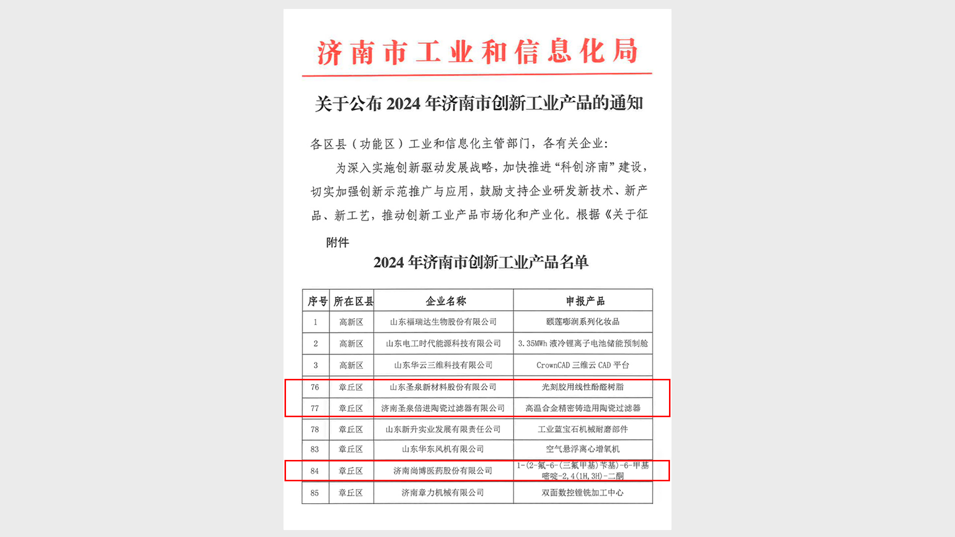 近日,济南市工业和信息化局公布了2024年济南市创新工业产品名单。其中,山东圣泉新材料股份有限公司光刻胶用线性酚醛树脂、济南圣泉倍进陶瓷过滤器有限公司高温合金精密铸造用陶瓷过滤器、济南尚博医药股份有限公司的1-(2-氟-6-(三氟甲基)苄基)-6-甲基嘧啶-2,4(1H,3H)-二酮等新产品成功入选。