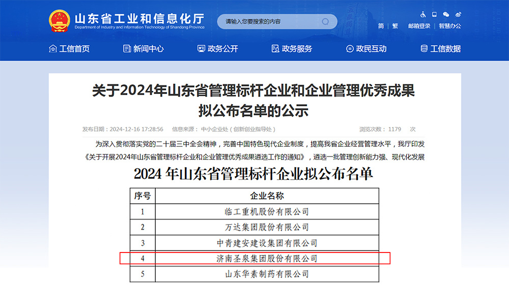近日,山东省工业和信息化厅发布了关于2024年山东省管理标杆企业和企业管理优秀成果公示名单。济南圣泉集团股份有限公司成功入选2024年山东省管理标杆企业,这是对公司经营管理水平、管理创新能力、现代化发展质效的充分肯定和认可。